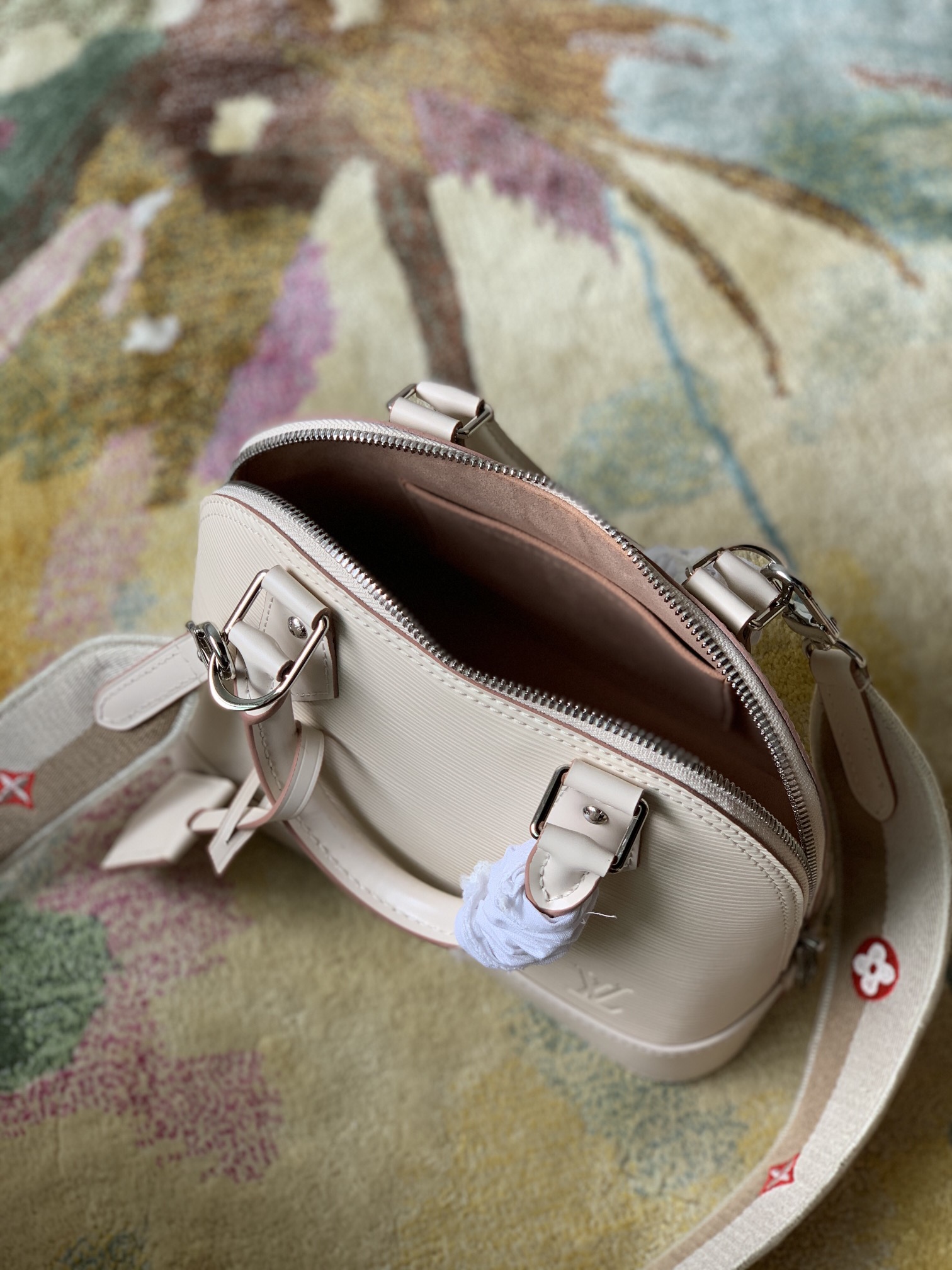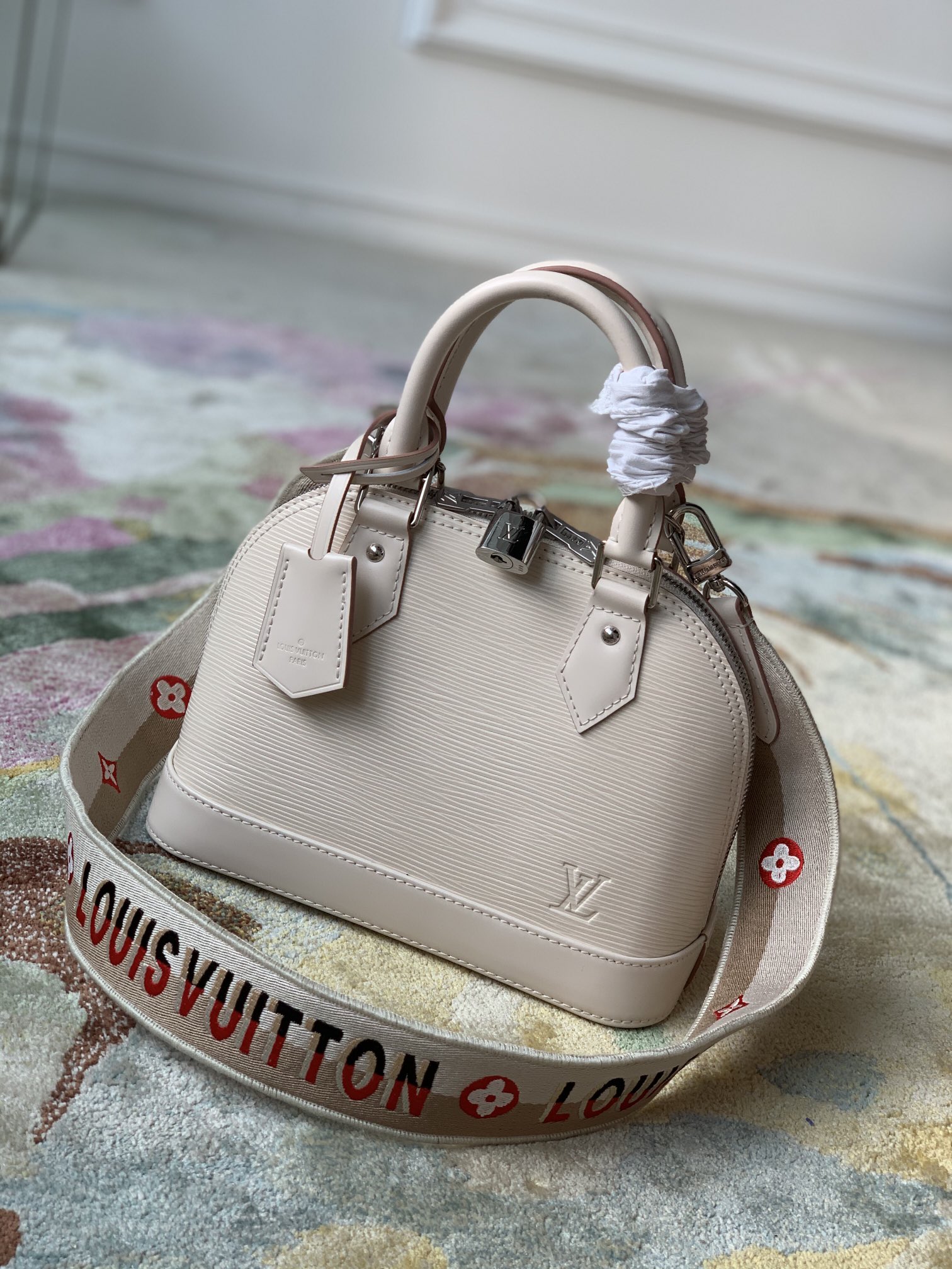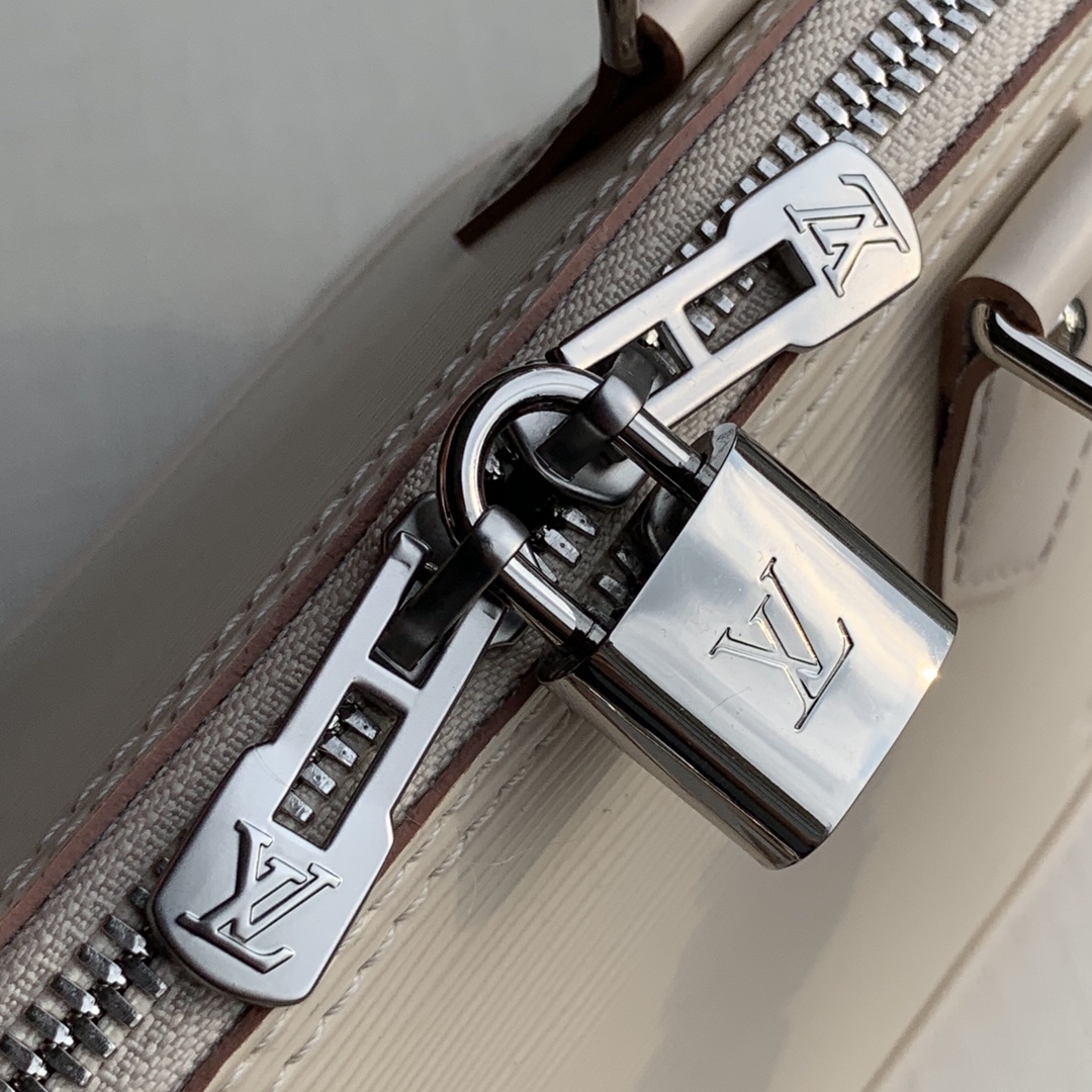 This is a replica LOUIS VUITTON M58706 Alma BB. ,9.3 x 6.9 x 4.5 inches ,Quartz White,Epi grained cowhide leather,Epi-leather trim and Jacquard strap,Microfiber lining,Silver-color hardware,Double zip closure,Padlock,Key bell,Inside flat pocket,4 protective metal bottom studs,Fits: 6.7-inches smartphone, earphones, lipstick, tissues, keys, sunglasses,Strap:Removable, not adjustable,Strap drop:19.7 inches,Handle:Double