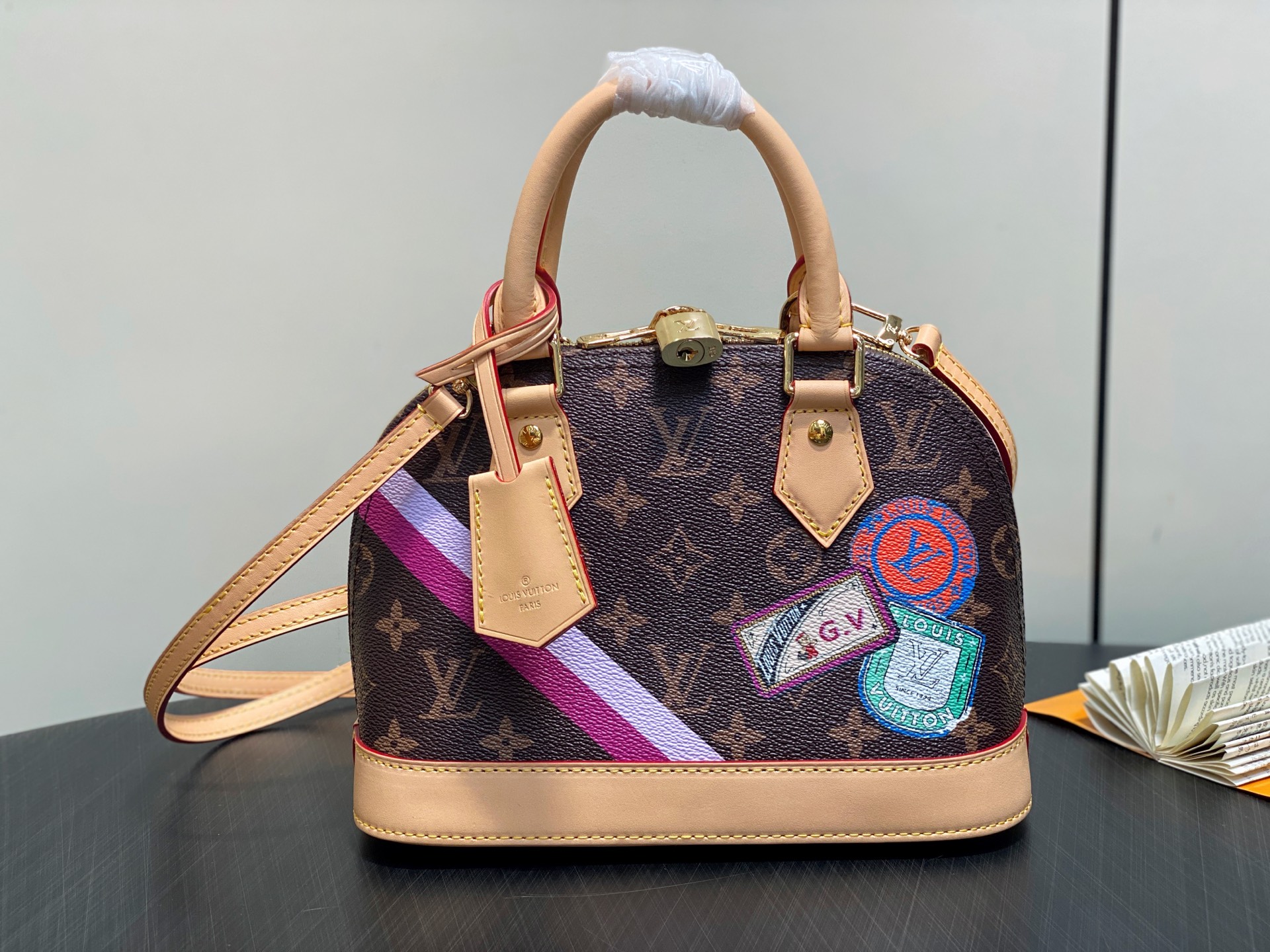 This is a replica LOUIS VUITTON P01917 Mon Monogram Alma BB Bag. ,23.5 x 17.5 x 11.5 cm ,Monogram coated canvas,Cowhide leather trim,Textile lining,Gold-colour hardware,Double zip closure,Padlock,Key bell,Flat inside pocket,4 protective metal bottom studs,Fits 6.7-inch smartphone, earphones, lipstick, tissues, keys, sunglasses,Weight: 0.5 kg,Strap: Removable, non-adjustable,Strap Drop: 56.0 cm,Handle: Single x2