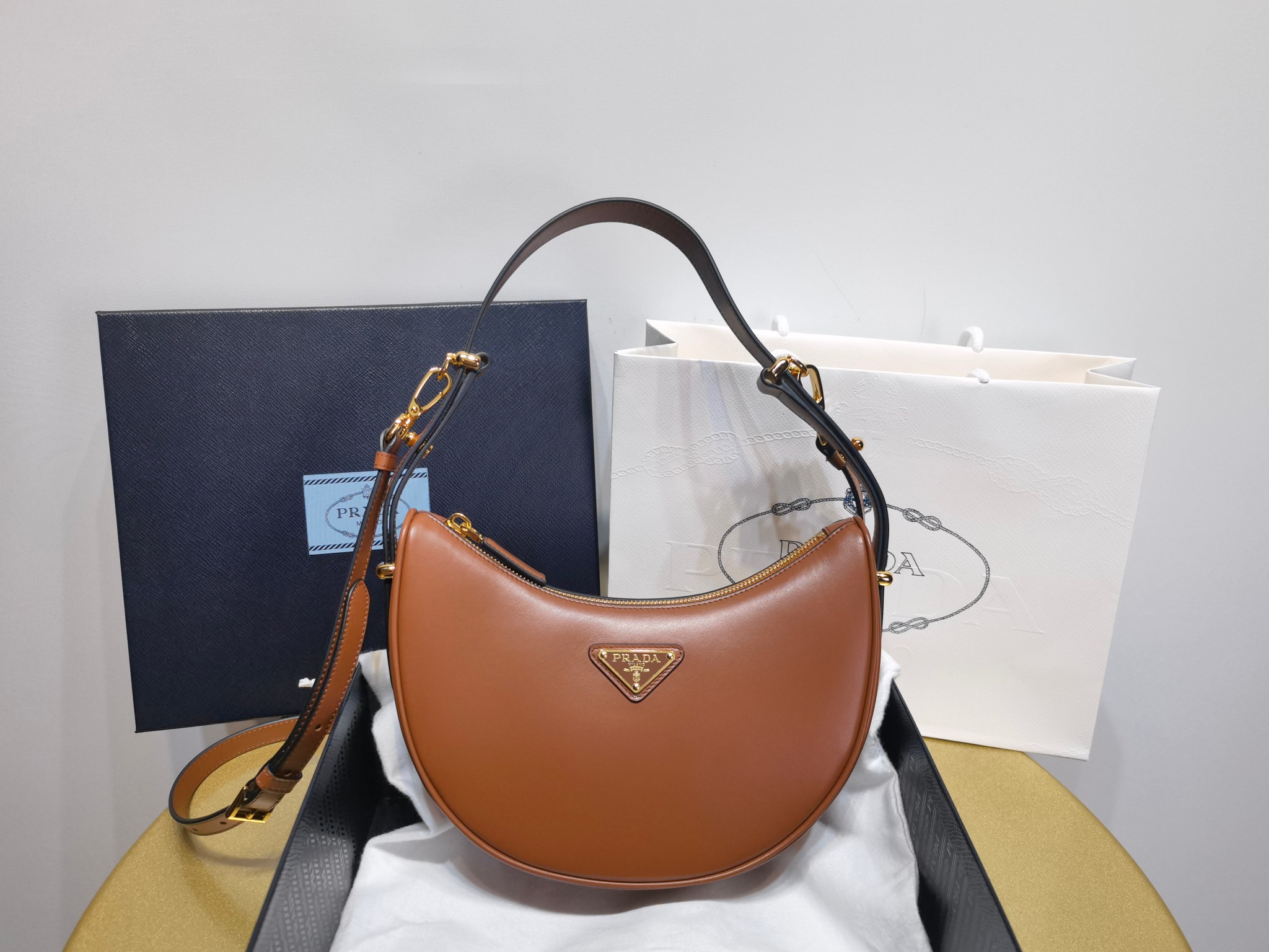 This is a replica Prada 1BC194 Arqué leather small shoulder bag. ,Detachable, adjustable leather handle,Detachable, adjustable leather shoulder strap. Max. length: 93 cm – Min. length: 83 cm – Max. drop length: 60 cm – Min. drop length: 55 cm,Metal hardware,Enameled metal triangle logo on the front,Zipper closure,Nappa leather interior with patch pocket,Imported,Height: 18.5cm,Width: 22.5cm,Length: 6cm
