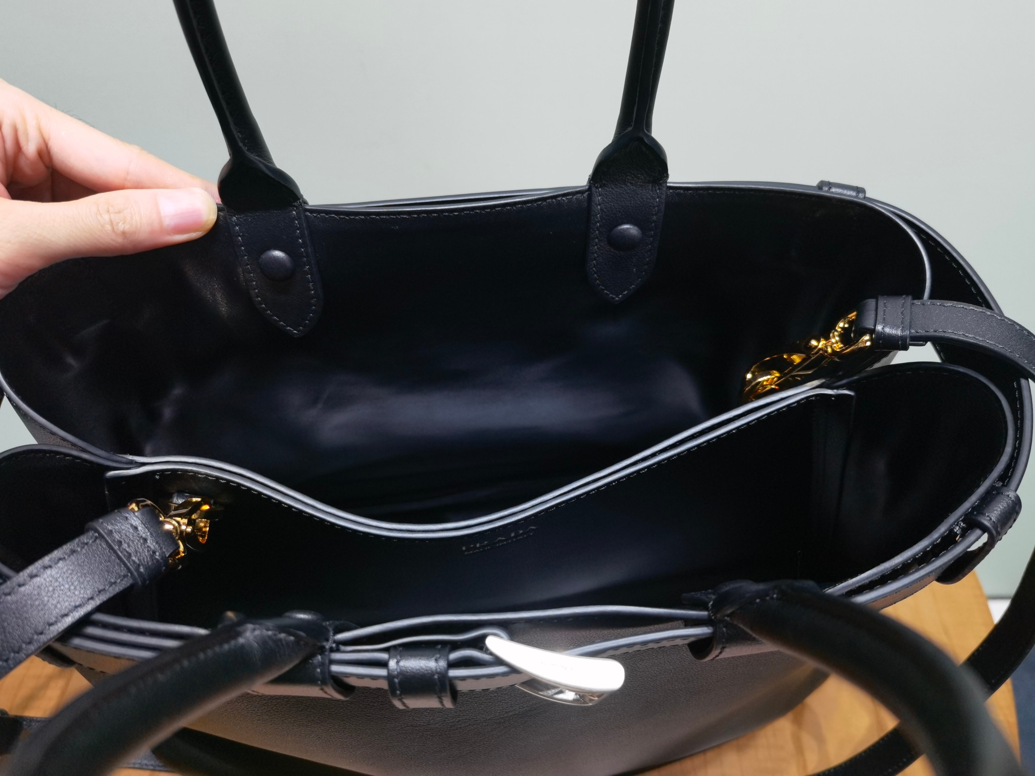 This is a replica Prada Buckle 1BA416 Large Leather Drawstring Bag. ,Buckle-decorated straps,Leather handle,Removable and adjustable leather shoulder strap Maximum length 110 cm – Minimum length 100 cm – Maximum drop 55 cm – Minimum drop 50 cm,Metal hardware accessories,Leather front with embossed logo lettering,Nappa leather interior with middle pocket,