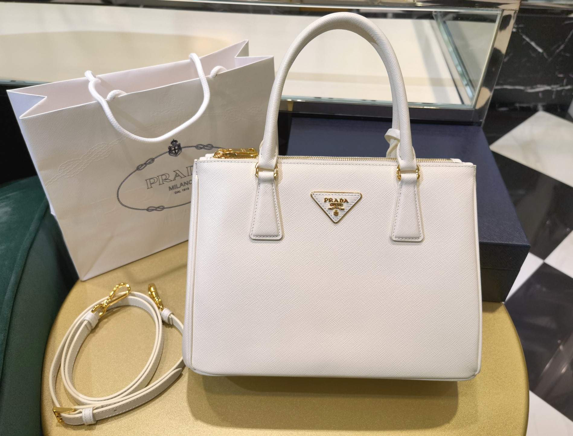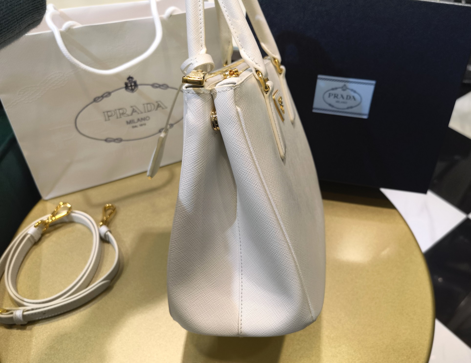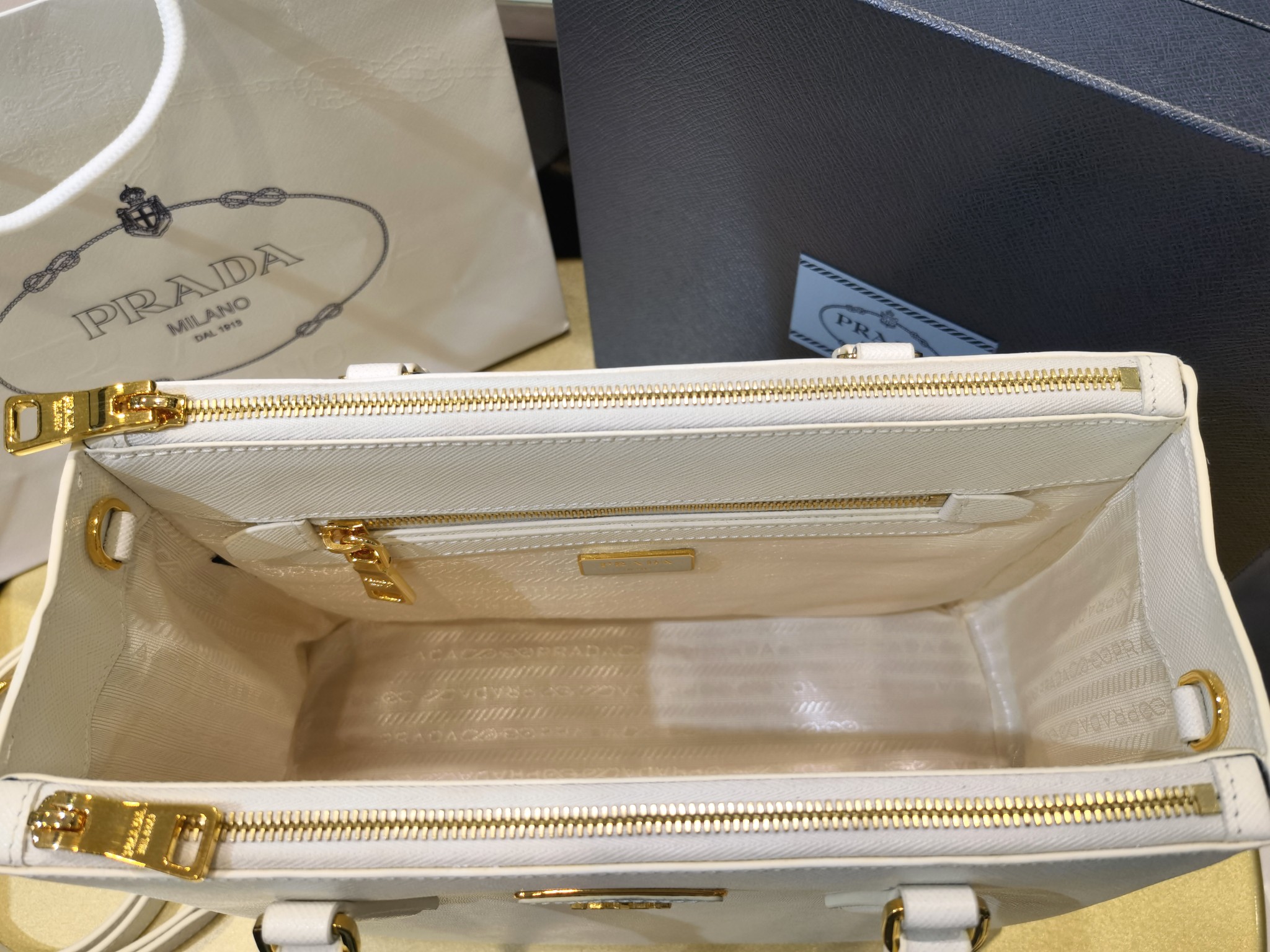 This is a replica Prada Galleria 1BA863 medium leather bag. ,Leather handles,Detachable, adjustable leather shoulder strap. Max. length: 120 cm – Min. length: 110 cm – Max. drop length: 60 cm – Min. drop length: 55 cm,Removable leather key ring,External zipper pockets,Metal hardware,Leather triangle with metal lettering logo on the front,Snap closure on the sides,Logo-print nylon lining with two pockets, including one with zipper,With purse feet,Height: 19.5cm,Width: 28cm,Length: 12cm