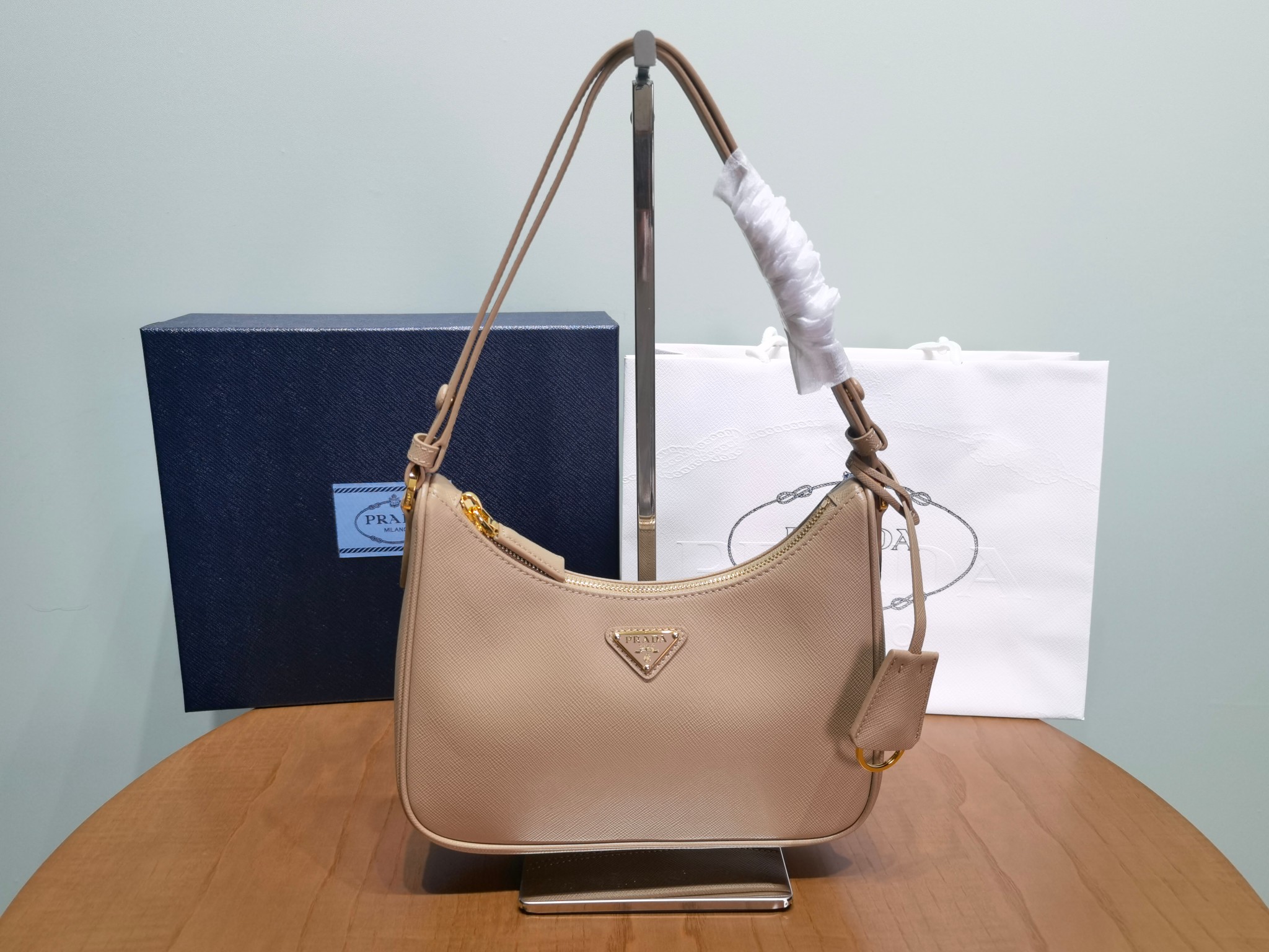 This is a replica Prada Re-Edition 1BC204 Saffiano leather mini-bag. ,Detachable, adjustable chain and leather handle,Removable leather key ring,Metal hardware,Enameled metal triangle logo on the front,Zipper closure,Logo-print nylon lining,Height: 18cm,Width: 22cm,Length: 6cm
