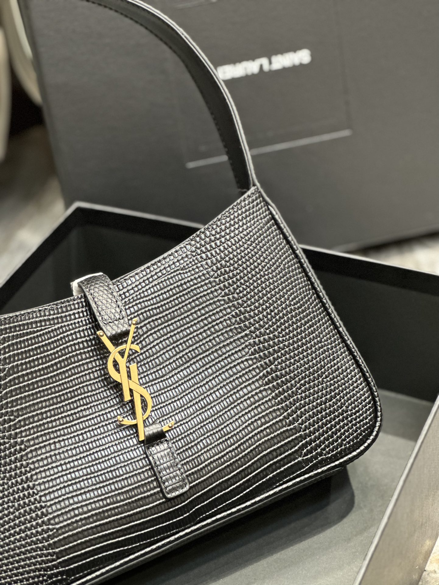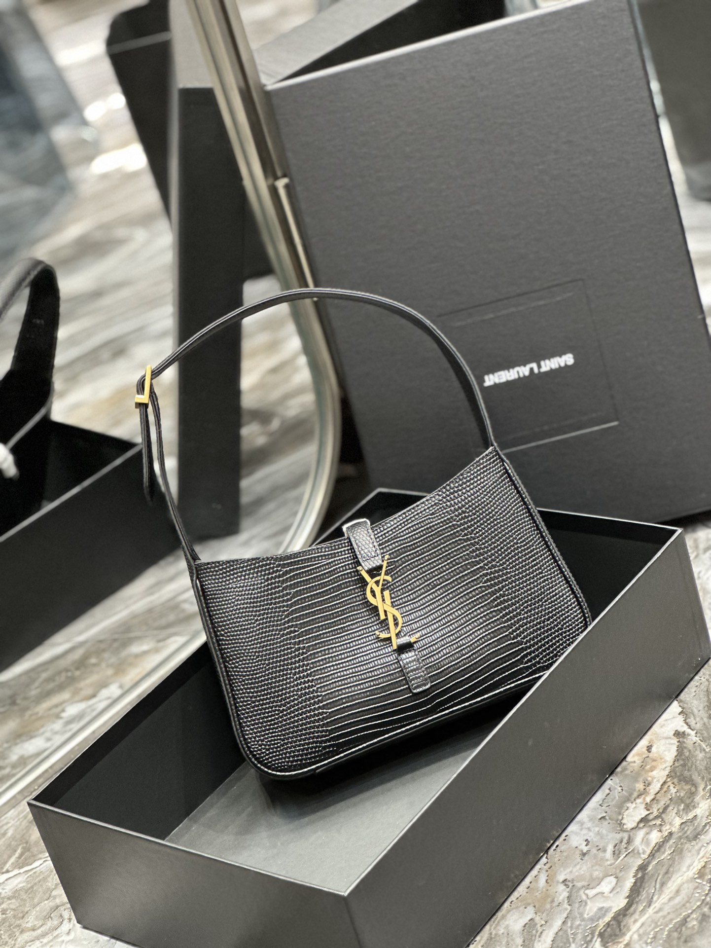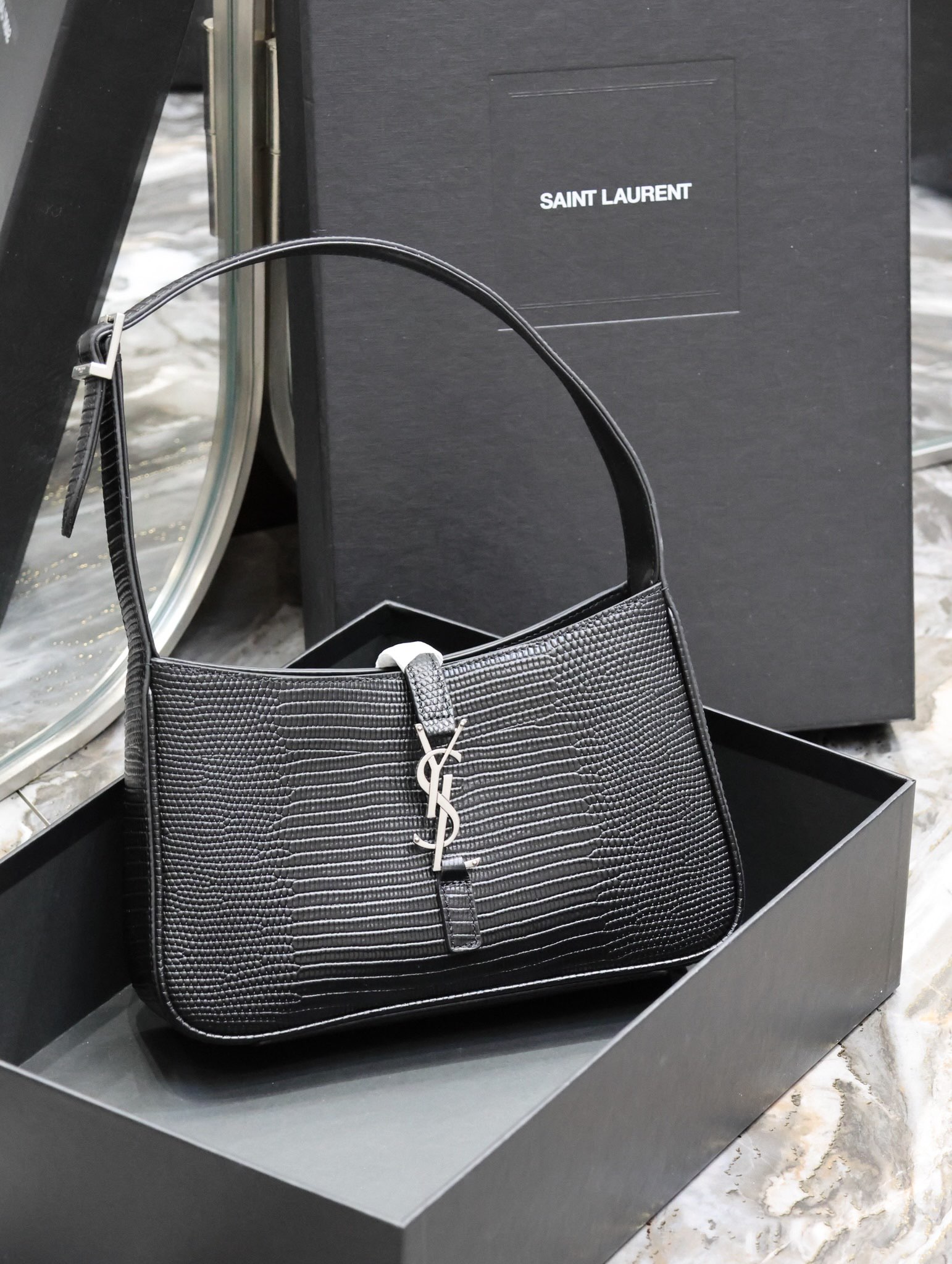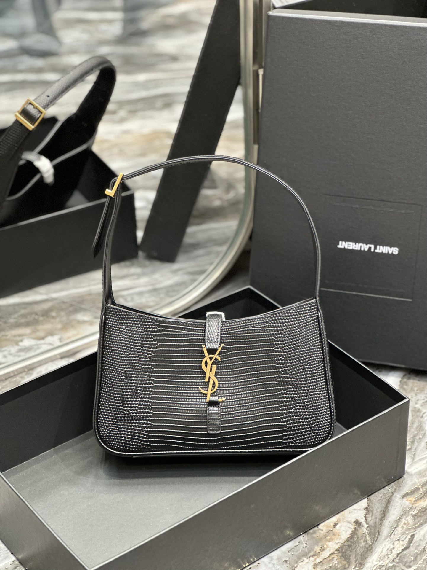 This is an replica SAINT LAURENT Le 5 À 7 in lizard-embossed shiny leather.,Hobo bag with an adjustable strap and CASSANDRE hook closure.,