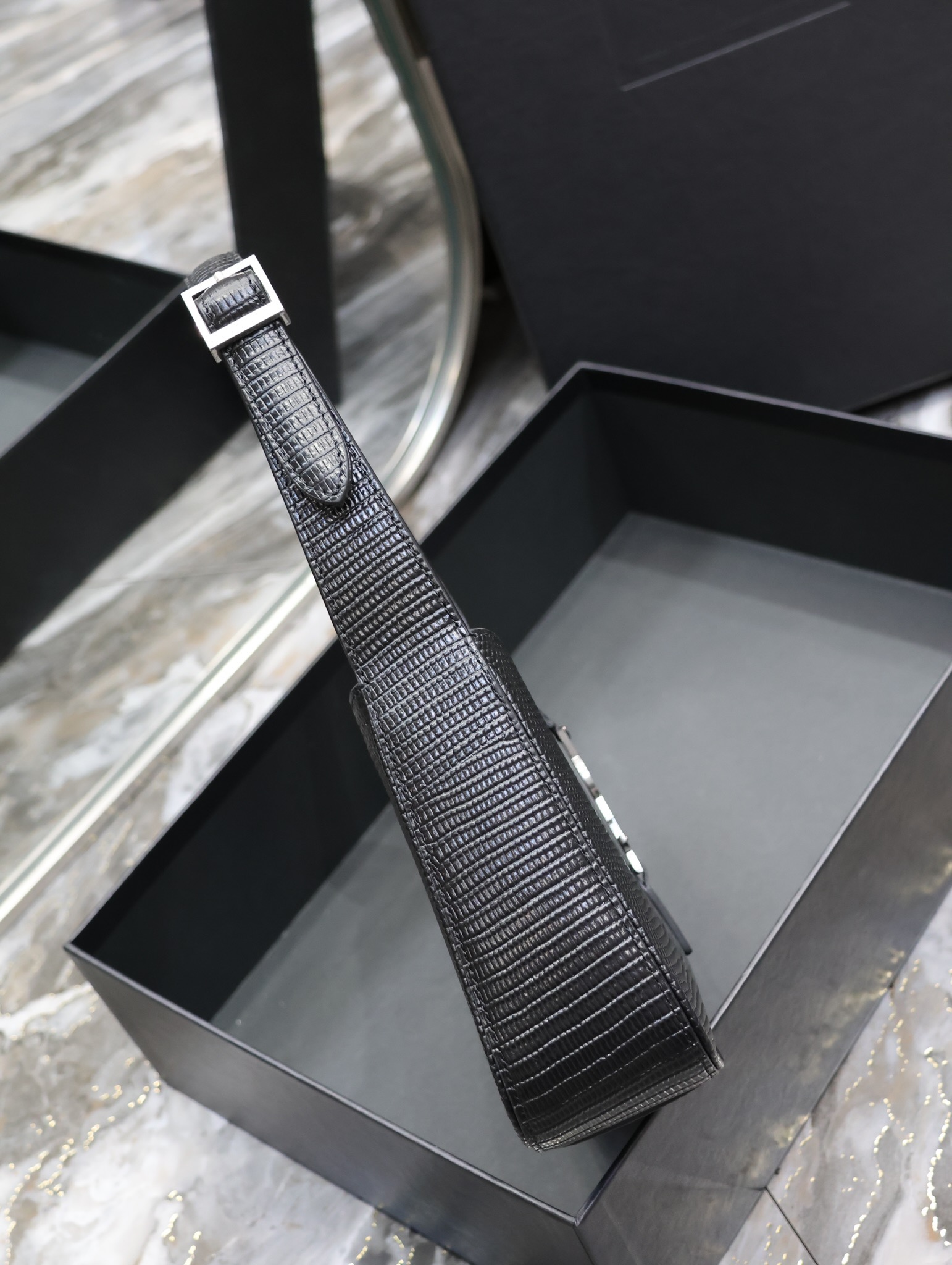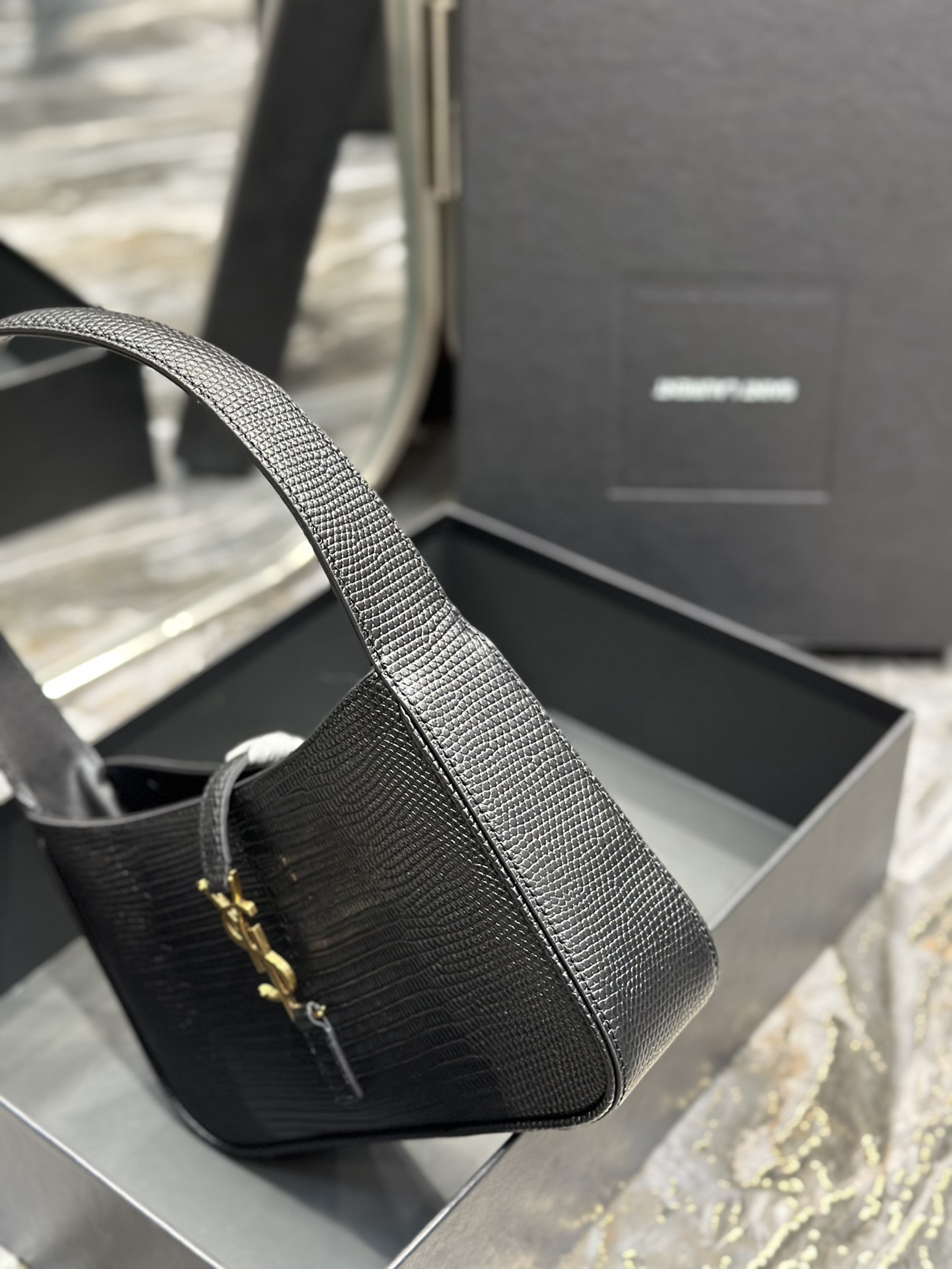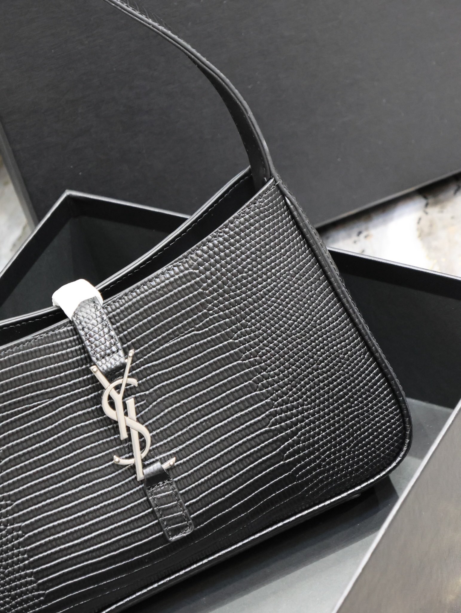 This is an replica SAINT LAURENT Le 5 À 7 in lizard-embossed shiny leather.,Hobo bag with an adjustable strap and CASSANDRE hook closure.,