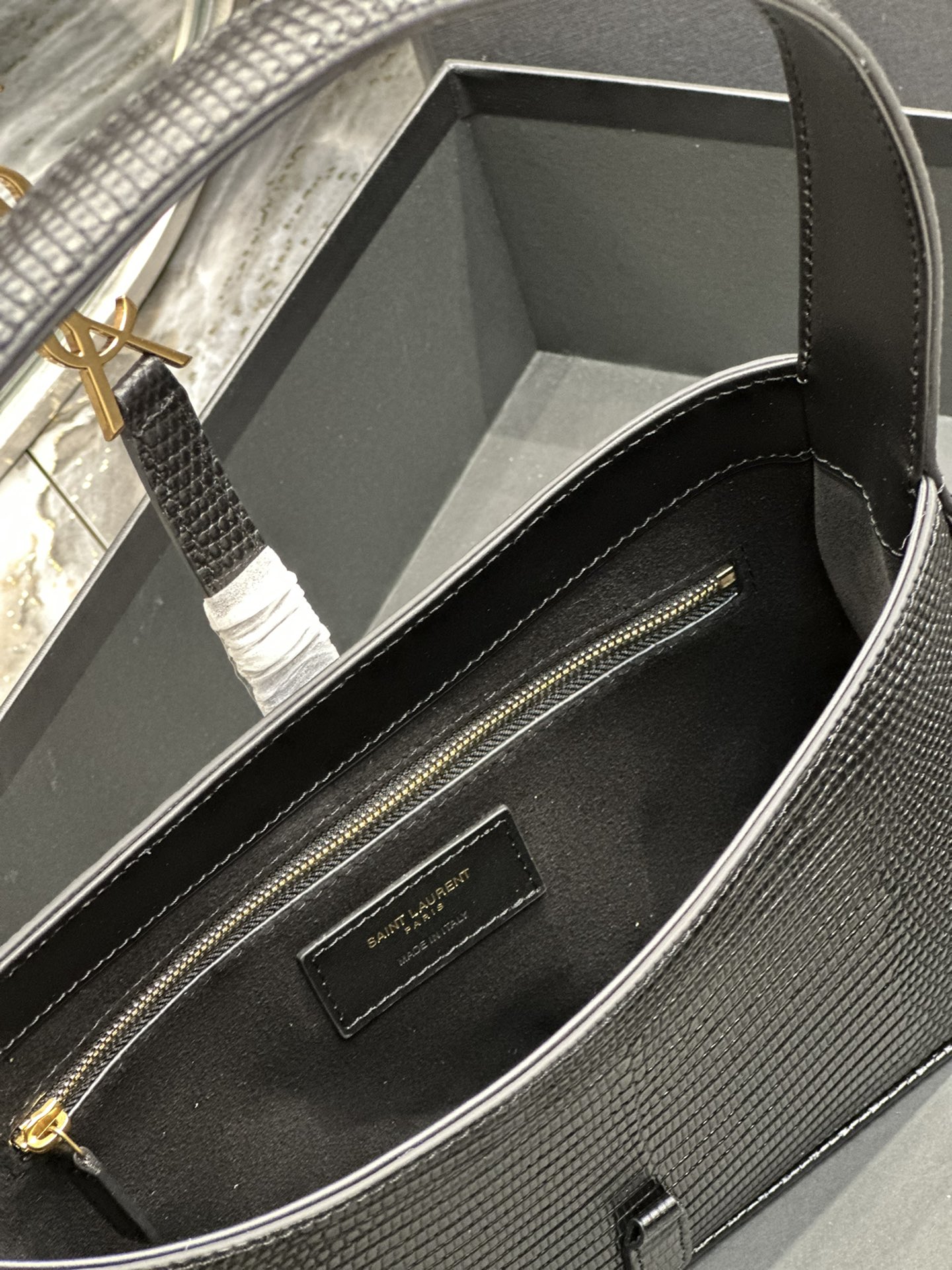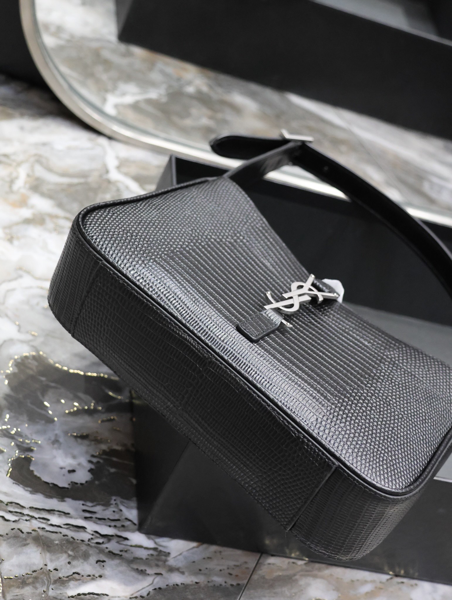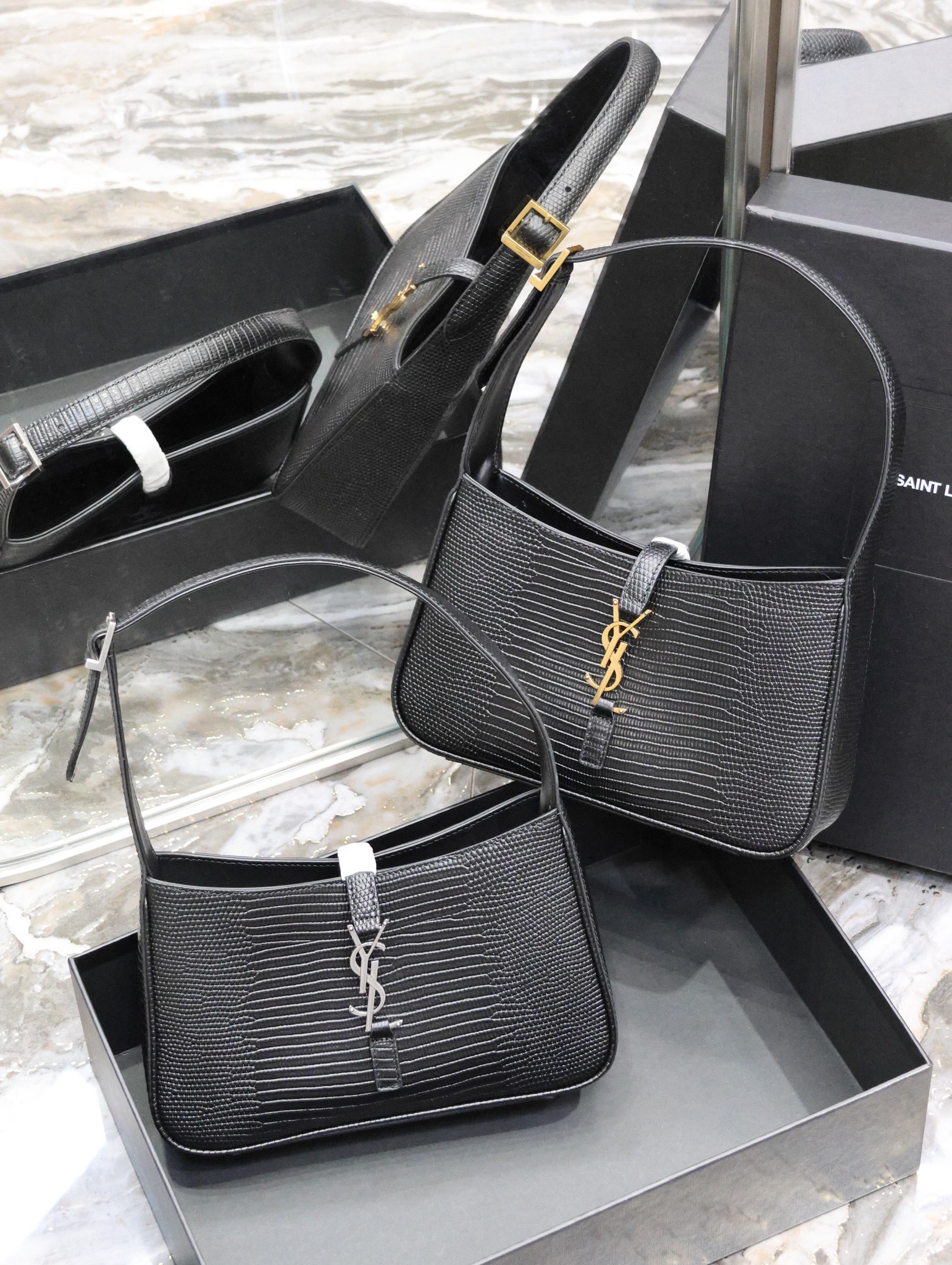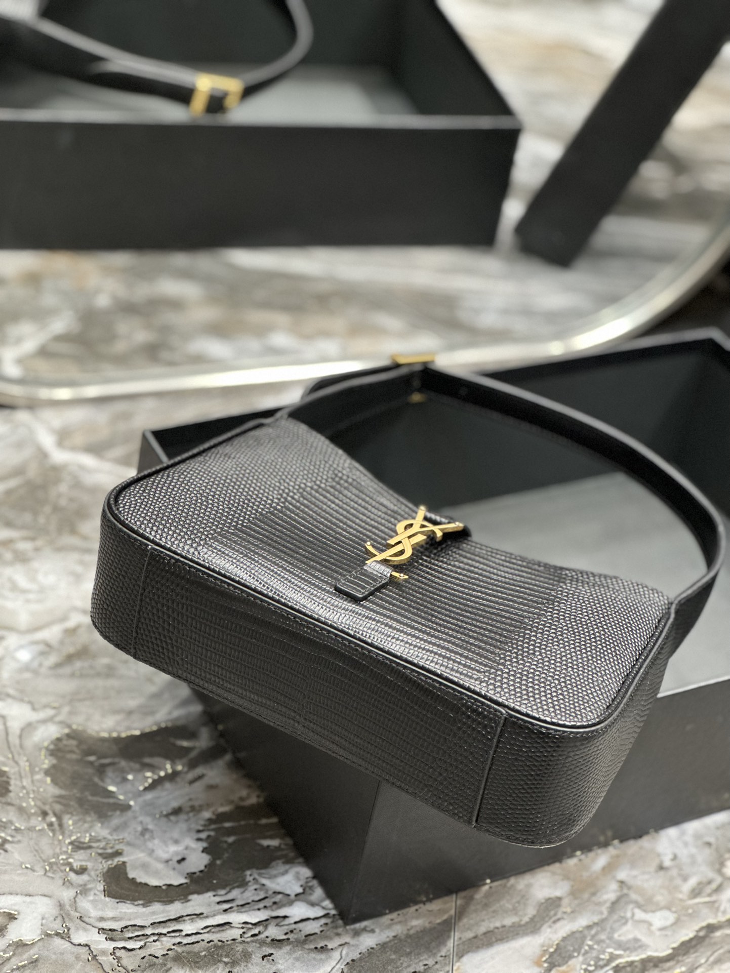 This is an replica SAINT LAURENT Le 5 À 7 in lizard-embossed shiny leather.,Hobo bag with an adjustable strap and CASSANDRE hook closure.,