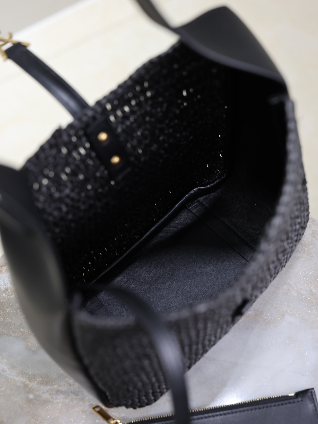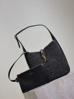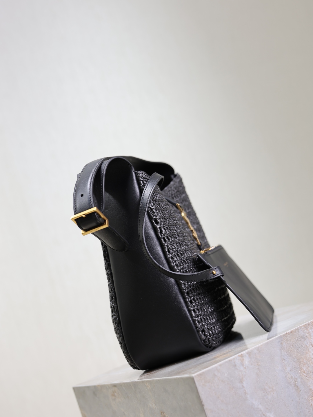 This is an replica SAINT LAURENT small version of the iconic 5 À 7 in raffia and vegetable-tanned leather.,