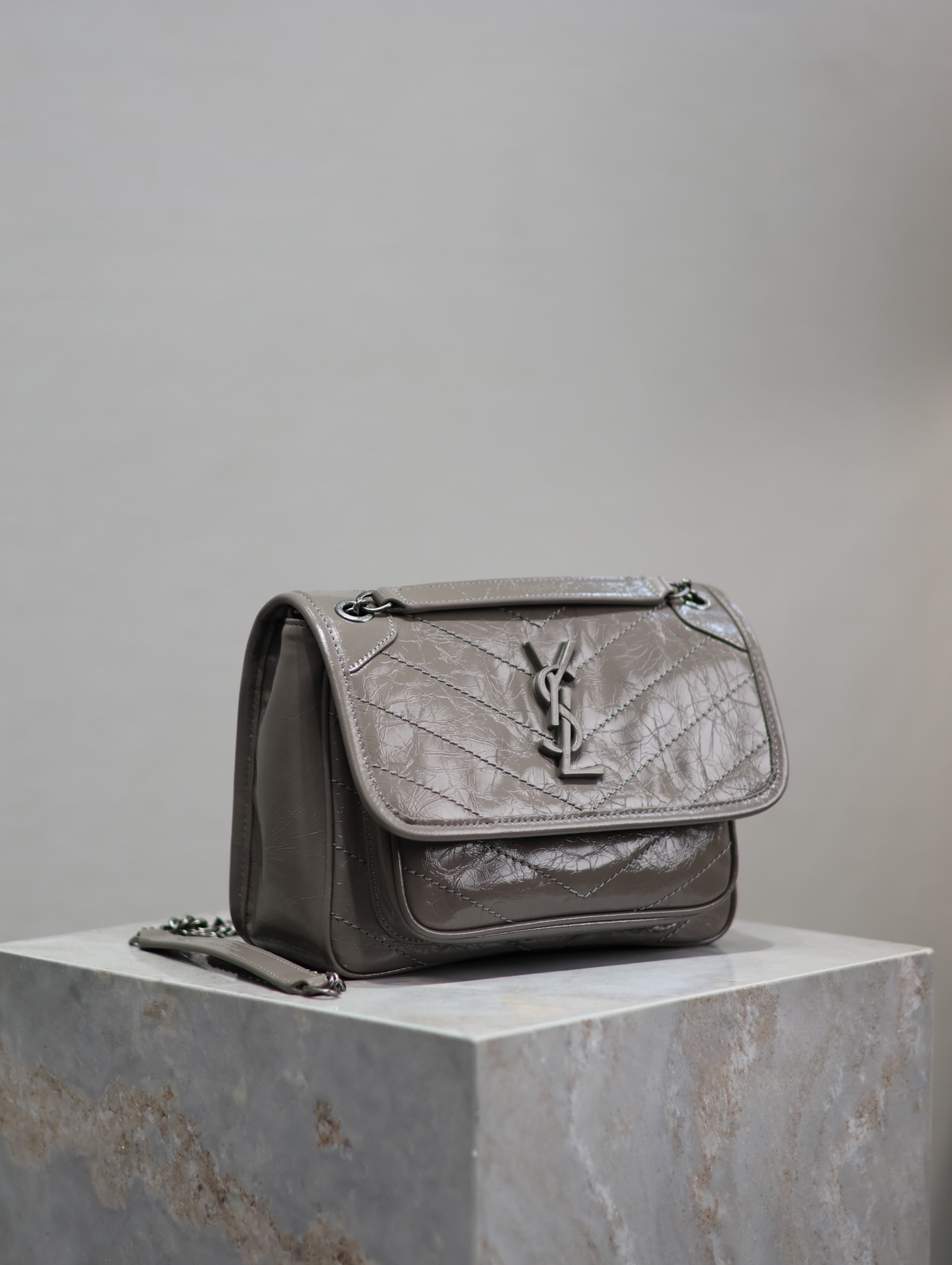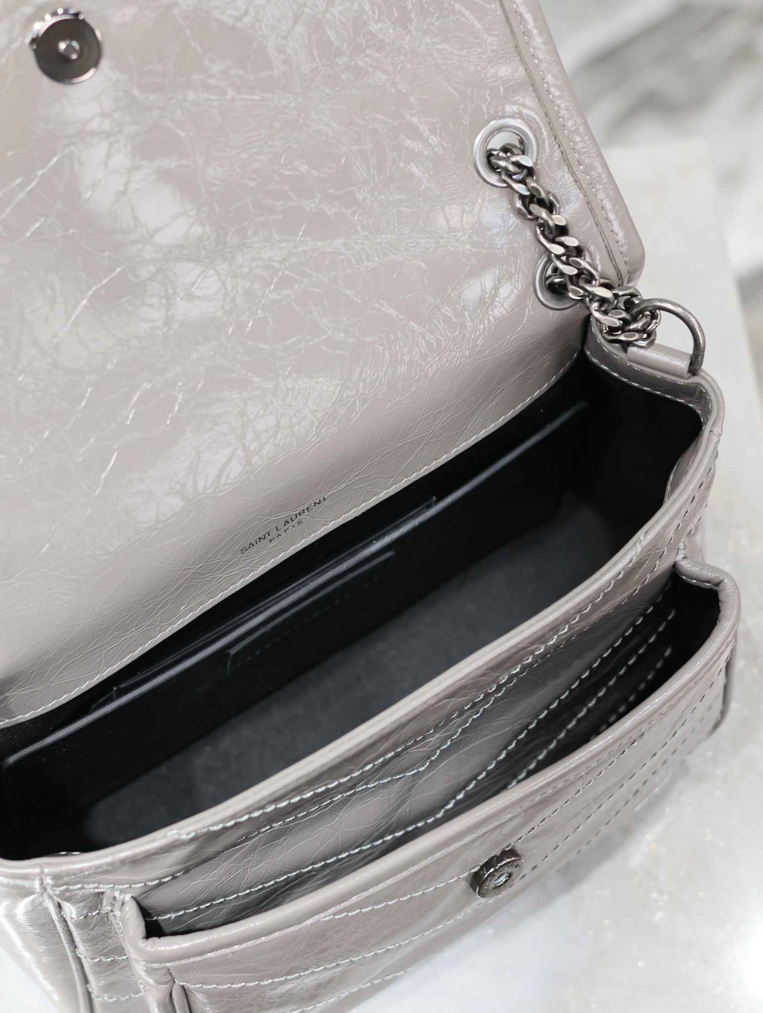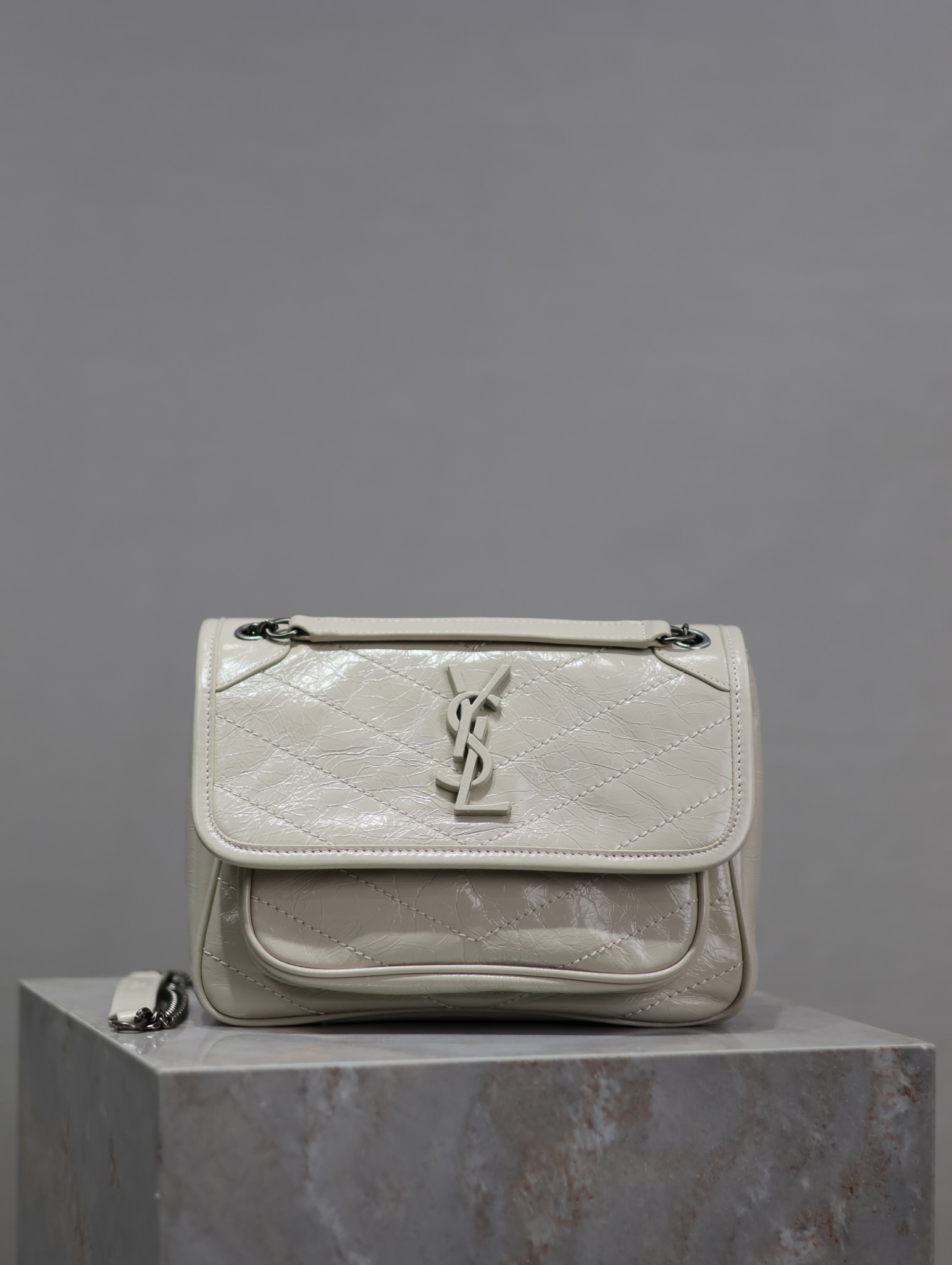 This is an replica SAINT LAURENT NIKI baby in vintage leather.,FLAP BAG IN VINTAGE CALF LEATHER, FEATURING CHEVRON QUILT OVERSTITCHING AND LEATHER-ENCASED CASSANDRE.,LIGHT, WITH TWO COMPARTMENTS AND A LARGE BACK SLOT POCKET.,FEATURES A SLIDING CHAIN STRAP THAT CAN BE WORN ON THE SHOULDER OR CROSSBODY.,